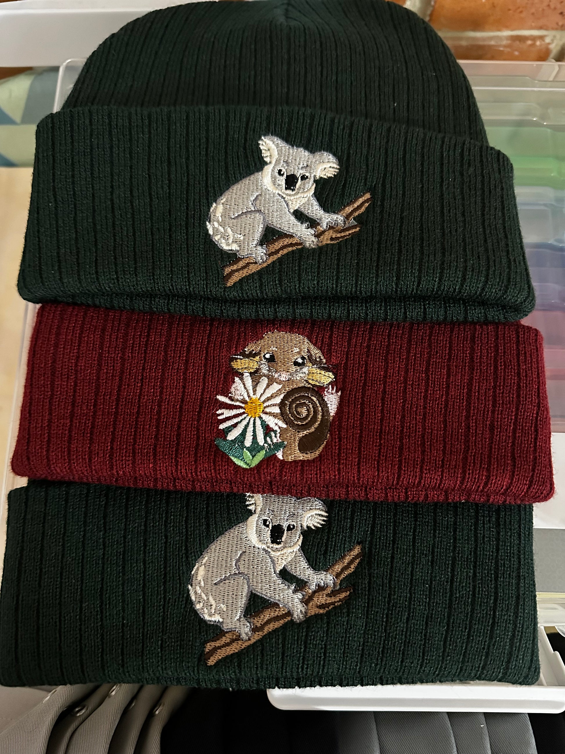 This pygmy possum design was hand-drawn and embroidered on to these cozy beanies by me, and I am a super fan of our unique Aussie wildlife!